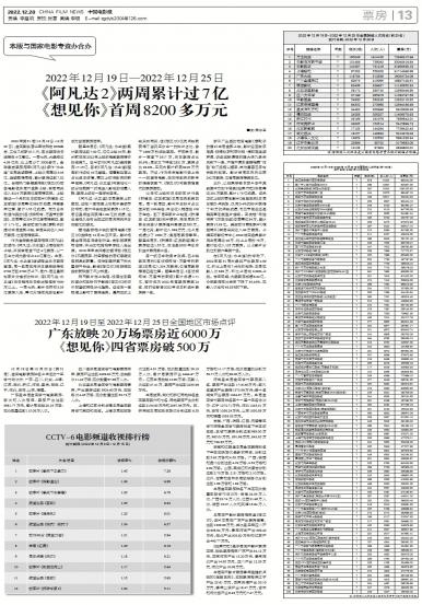 - 《阿凡达2》两周累计过7亿 《想见你》首周8200多万元